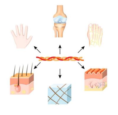Kolagen je bílkovina se specifickou trojitou helixovou strukturou. Patří mezi hlavní stavební prvky pojivových tkání a zajišťuje jejich pevnost a pružnost. S věkem jeho přirozená produkce klesá, což vede ke vzniku vrásek, ztrátě elasticity pokožky a problémům s klouby.