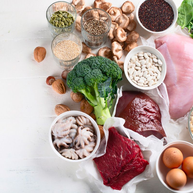 Železo se vyskytuje ve dvou formách: heme a neheme. Heme železo, které se nachází v masných produktech (maso a vnitřnosti) je lépe vstřebatelné. Neheme železo najdeme v rostlinných zdrojích, jako jsou luštěniny, ořechy, semena, tmavě zelená zelenina a obiloviny obohacené železem. Pro lepší vstřebávání neheme železa je doporučeno konzumovat je společně s potravinami bohatými na vitamin C.
